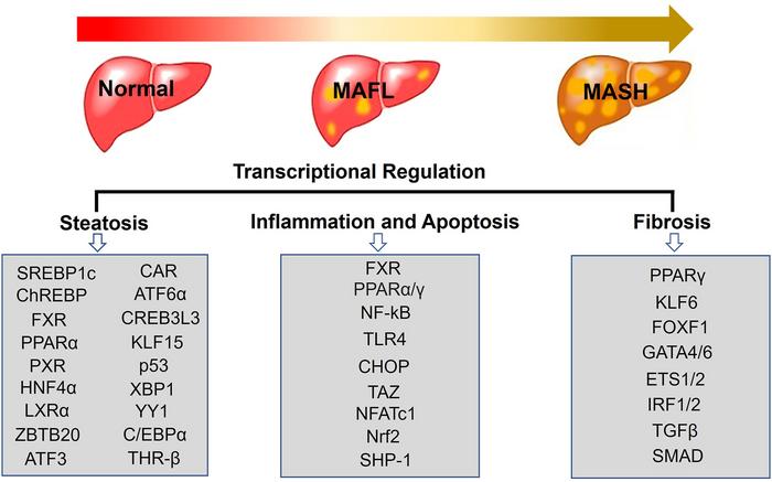 Transcriptional regulation of steatosis, inflammation, apoptosis, and fibrosis in the progression of MAFLD.