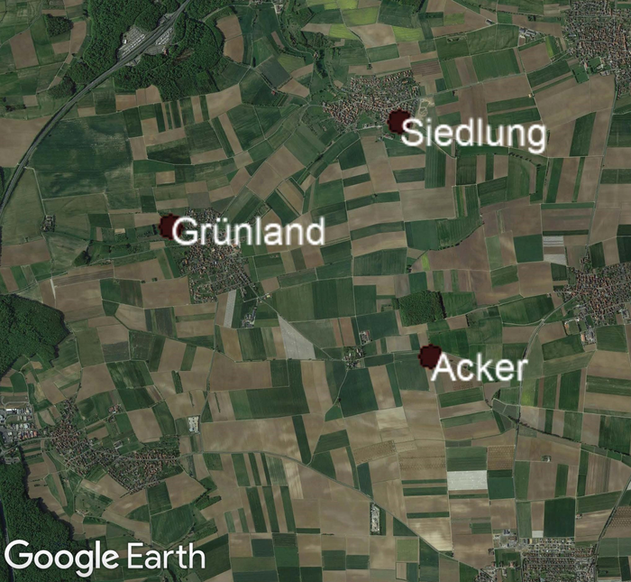 LandKlif study region in Bavaria with three experimental sites (grassland, arable land, settlement). The region is predominantly used for agriculture and has a warm climate.