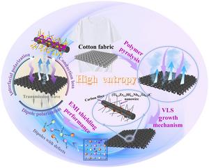 Utilizing waste cotton fabric as a dual-functional flexible substrate and carbon source, this work enabled vapor-liquid-solid growth of high-entropy carbide nanowires. The resulting material achieved exceptional EMI shielding through synergistic electrical conduction loss, dipolar polarization loss, and interfacial polarization loss.