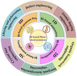 Using photoelectrocatalytic CO2 reduction reaction (CO2RR) to produce valuable fuels is a fascinating way to alleviate environmental issues and energy crises. Bismuth-based (Bi-based) catalysts have attracted widespread attention for CO2RR due to their high catalytic activity, selectivity, excellent stability, and low cost. However, they still need to be further improved to meet the needs of industrial applications. This review article comprehensively summarizes the recent advances in regulation strategies of Bi-based catalysts and can be divided into six categories: (1) defect engineering, (2) atomic doping engineering, (3) organic framework engineering, (4) inorganic heterojunction engineering, (5) crystal face engineering, and (6) alloying and polarization engineering. Meanwhile, the corresponding catalytic mechanisms of each regulation strategy will also be discussed in detail, aiming to enable researchers to understand the structure–property relationship of the improved Bi-based catalysts fundamentally. Finally, the challenges and future opportunities of the Bi-based catalysts in the photoelectrocatalytic CO2RR application field will also be featured from the perspectives of the (1) combination or synergy of multiple regulatory strategies, (2) revealing formation mechanism and realizing controllable synthesis, and (3) in situ multiscale investigation of activation pathways and uncovering the catalytic mechanisms. On the one hand, through the comparative analysis and mechanism explanation of the six major regulatory strategies, a multidimensional knowledge framework of the structure–activity relationship of Bi-based catalysts can be constructed for researchers, which not only deepens the atomic-level understanding of catalytic active sites, charge transport paths, and the adsorption behavior of intermediate products, but also provides theoretical guiding principles for the controllable design of new catalysts; on the other hand, the promising collaborative regulation strategies, controllable synthetic paths, and the in situ multiscale characterization techniques presented in this work provides a paradigm reference for shortening the research and development cycle of high-performance catalysts, conducive to facilitating the transition of photoelectrocatalytic CO2RR technology from the laboratory routes to industrial application.