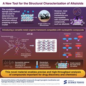 A new metal–organic framework (MOF), APF-80, enables the crystalline sponge method to capture and analyze nucleophilic compounds. Alkaloids, a diverse group of biologically active compounds, usually damage MOF crystals and resist study. By incorporating multiple structural motifs, these guests are encapsulated inside APF-80, which allows high-quality crystallographic data collection. This development opens new possibilities for structural analysis, advancing drug development and biochemistry.