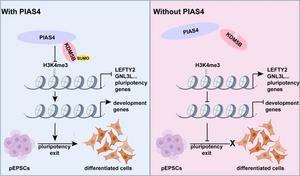 This study uncovers a new molecular mechanism by which the E3 ubiquitin ligase PIAS4 orchestrates pluripotency exit and lineage commitment in porcine embryonic stem cells (pESCs). Using a genome-wide CRISPR screening approach, the researchers identified PIAS4 as a critical regulator that modulates histone H3K4me3 marks via SUMOylation-mediated stabilization of KDM5B. Loss of PIAS4 impaired stem cell differentiation, disrupted lineage specific gene programs, and altered mesendoderm specification through LEFTY2–SMAD signaling. These findings not only provide fundamental insight into porcine stem cell biology but also pave the way for applications in livestock breeding, artificial meat production, and regenerative medicine.